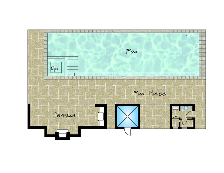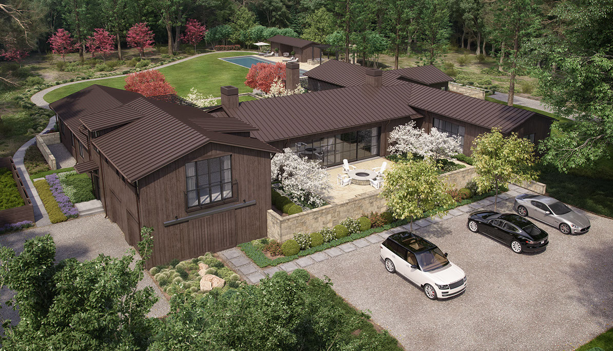 The estate is laid out among a main house, guest house, pool house, spacious patios and a detached garage.